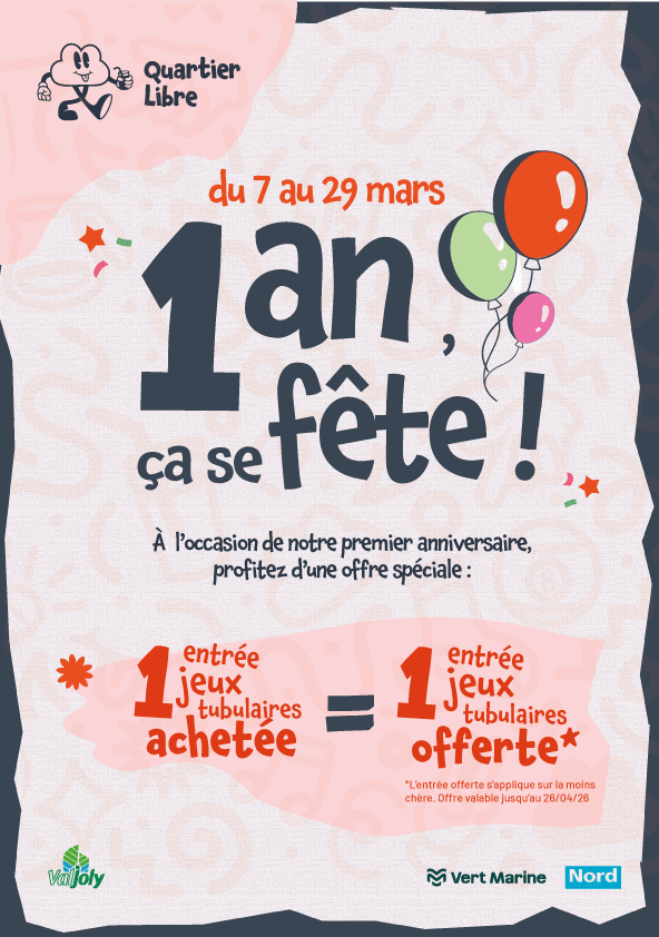Du 7 au 29 mars, profitez de notre offre exclusive : pour 1 entrée aux jeux tubulaires achetée, la 2ᵉ est offerte !